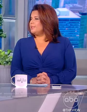 Ana Navarro on The View on ABC was spotted wearing this blue twist front dress on The View on Jan 24 2022's episode. Ana's Dress is the Knot Front Pleated Skirt Dress by Eloquii.