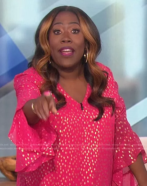 Sheryl Underwood on The Talk on CBS was spotted wearing this pink metallic flutter sleeve blouse on The Talk on Jan 24 2022's episode. Sheryl's Top is the Dash Dot Flutter Sleeve Tunic by Vince Camuto.