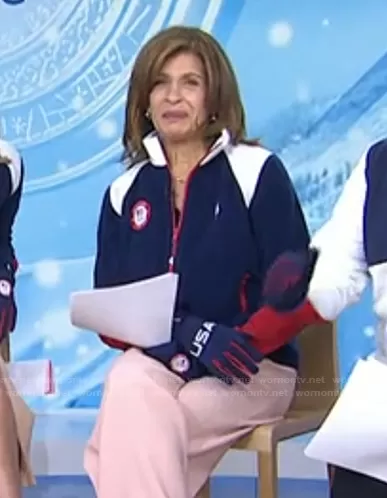 Hoda Kotb on Today on NBC was spotted wearing this navy jacket and USA print gloves on Today on Jan 20 2022's episode. Hoda's Jacket is the Team USA Opening Ceremony Mid Jacket by Ralph Lauren . Hoda's Gloves is the Team USA Closing Ceremony Gloves by Ralph Lauren.