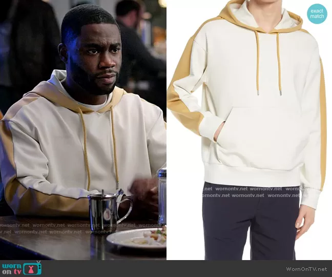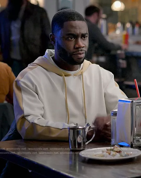 James (played by Garrick Bernard) on Single Drunk Female on Freeform was spotted wearing this white and tan colorblock hoodie on Single Drunk Female on episode 'One Day at a Time' (1x02) in Jan 2022. James's Sweatshirt is the Colorblock Double Face Hoodie by Club Monaco.
