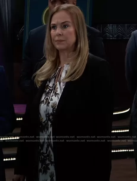 Laura Collins (played by Genie Francis) on General Hospital on ABC was spotted wearing this white floral print tie neck blouse on General Hospital on Jan 25 2022's episode. Laura's Top is the Eboni Floral-Printed Blouse by Kobi Halperin.