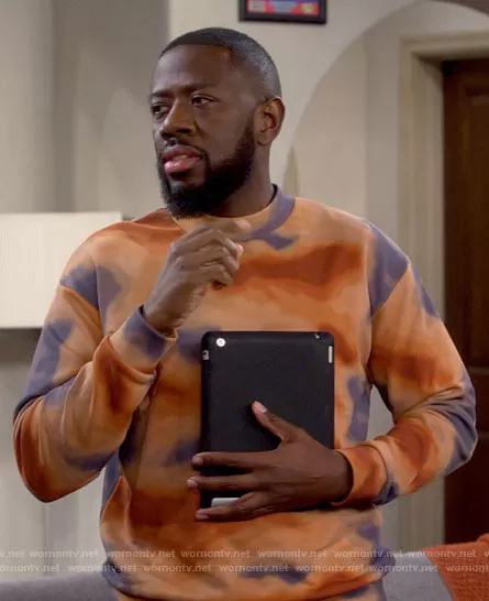 Malcom (played by Sheaun McKinney) on The Neighborhood on CBS was spotted wearing this orange tie dye sweater on The Neighborhood on episode 'Welcome to the Big One' (4x12) in Jan 2022. Malcolm's Sweater is the Printed relaxed-fit crewneck sweater by Scotch & Soda.