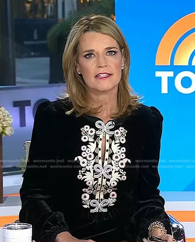 Savannah Guthrie on Today on NBC was spotted wearing this black embroidered velvet dress on Today on Dec 15 2023's episode. Savannah's Dress is the Camille Embellished Embroidered Velvet Midi Dress by Saloni.