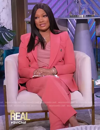 Garcelle Beauvais on The Real on BETher was spotted wearing this pink double breasted blazer on The Real on Jan 25 2022's episode. Garcelle's Blazer is the Tailored Double Breasted Blazer by Zara . Garcelle's Pants is the Menswear Style Wide Leg Pants by Zara.