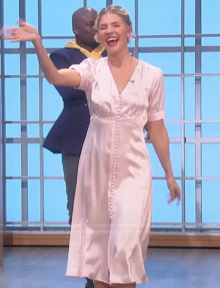 Amanda Kloots on The Talk on CBS was spotted wearing this white satin button down dress on The Talk on Jan 25 2022's episode. Amanda's Dress is the V-neck button-down satin midi dress by The Kooples.