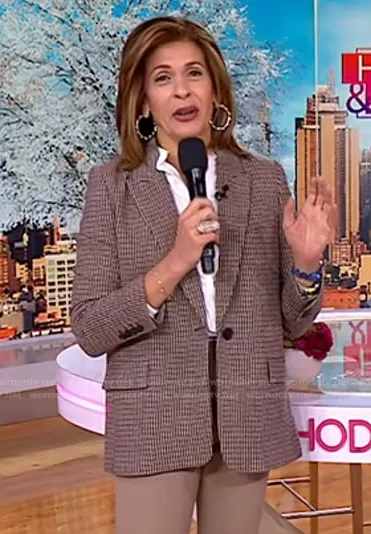 Hoda Kotb on Today on NBC was spotted wearing this brown check wool blazer on Today on Mar 09 2022's episode. Hoda's Jacket is the Wool Blend Elbow Patch Blazer by Zara.