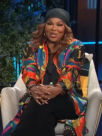 on E! News on E! was spotted wearing this Mona Scott-Young’s belt print kimono on E! News Daily Pop on Jan 26 2022's episode. 's Dress is the Barocco Rodeo Print Silk Midi Shirt Dress by Versace.