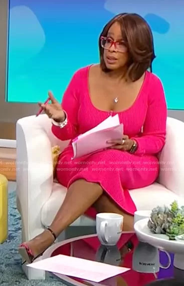 Gayle King’s pink scoop neck rib knit dress on CBS Mornings