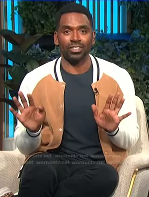 Justin Sylvester on E! News on E! was spotted wearing this beige and white varsity jacket on E! News Daily Pop on Jan 26 2022's episode. Justin's Jacket is the Towelling Bomber Jacket by Reiss.