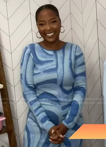 Makho Ndlovu on Today on NBC was spotted wearing this blue wave print long sleeve dress on Today on Jan 27 2022's episode. Makho's Dress is the Blue Moon Midi Dress by House of Sunny.