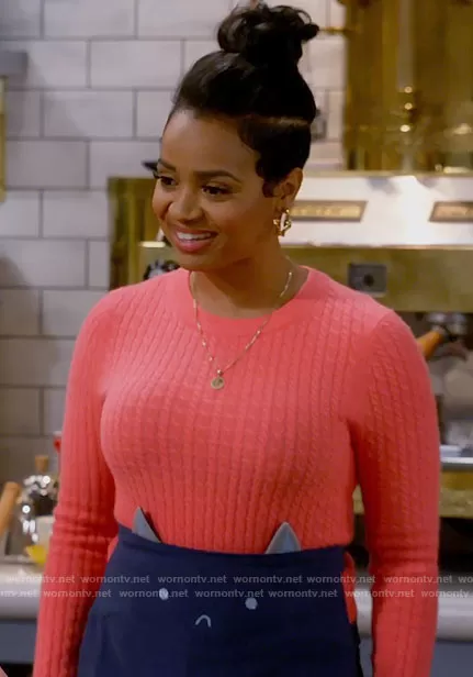 Randi (played by Kyla Pratt) on Call Me Kat on Fox was spotted wearing this coral cable knit sweater on Call Me Kat on episode 'Call Me Forty' (2x04) in Jan 2022. Randi's Sweater is the Ciara Cable Knit Sweater in Deep Coral by Alice + Olivia.
