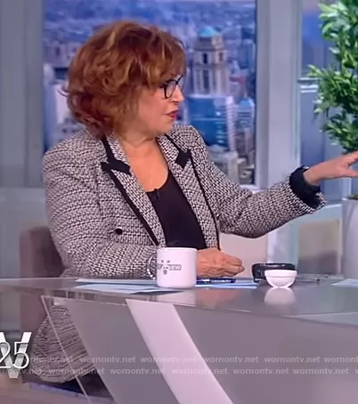 Joy Behar on The View on ABC was spotted wearing this tweed double breasted blazer on The View on Jan 28 2022's episode. Joy's Jacket is the Structured Blazer with Contrasting Piping by Zara.