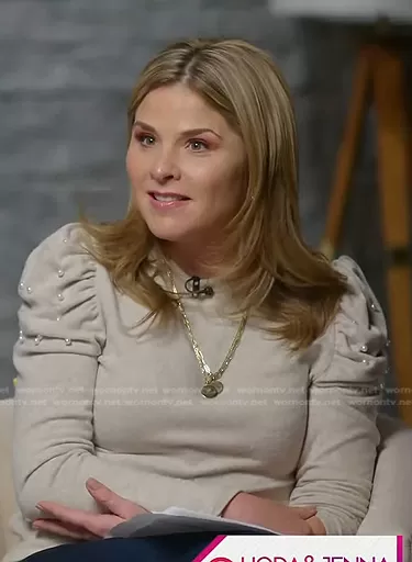 Jenna Bush Hager on Today on NBC was spotted wearing this grey pearl embellished puff sleeve sweater on Today on Aug 29 2022's episode. Jenna's Sweater is the Soft Feel Balloon Shoulder Sweatshirt by Zara.