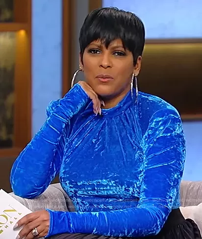 Tamron Hall on Tamron Hall Show on ABC was spotted wearing this blue crushed velvet top and skirt on Tamron Hall Show on Jan 28 2022's episode. Tamron's Top is the Ruched crushed-velvet top by The Attico . Tamron's Skirt is the Katz two-tone pleated satin midi skirt by Alice + Olivia.