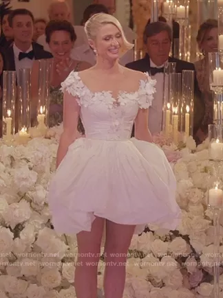 Paris Hilton on Paris in Love on Peacock was spotted wearing this mini wedding dress on Paris in Love on episode 'I Do, Don't I? Part 2' (1x13) in Jan 2022. Paris's Dress is the 2022 Spring Bridal Collection by Oscar de la Renta.