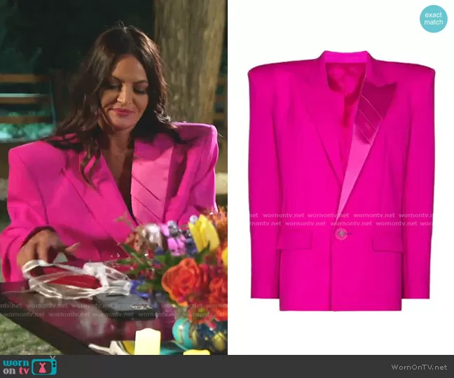 Lisa Barlow on The Real Housewives of Salt Lake City on Bravo was spotted wearing this pink padded shoulder blazer on The Real Housewives of Salt Lake City on episode 'Cinco De Mayhem' (2x19) in Jan 2022. Lisa's Jacket is the Shoulder-Pad Single-Breasted Blazer by The Attico.
