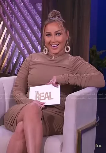 Adrienne Houghton on The Real on BETher was spotted wearing this Adrienne’s mocha ruched dress on The Real on Jan 31 2022's episode. Adrienne's Dress is the Ruched Long Sleeve Dress in Tan by ASTR The Label.