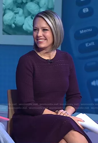 Dylan Dreyer on Today on NBC was spotted wearing this purple pointelle knit dress on Today on Dec 14 2022's episode. Dylan's Dress is the Sweater Knit Fit & Flare Dress by Eliza J.