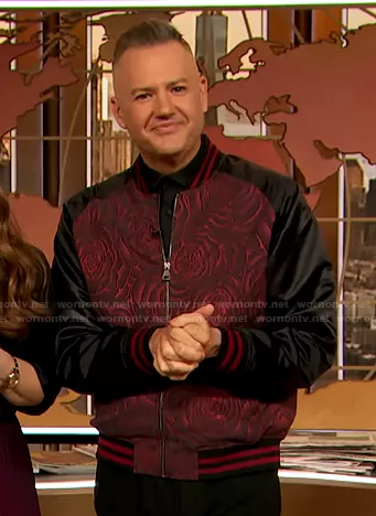 Ross Mathews on The Drew Barrymore Show on CBS was spotted wearing this rose print bomber jacket The Drew Barrymore Show on Feb 24 2022's episode. Ross's Jacket is the Slim-Fit Rose Bomber Jacket by Tallia.