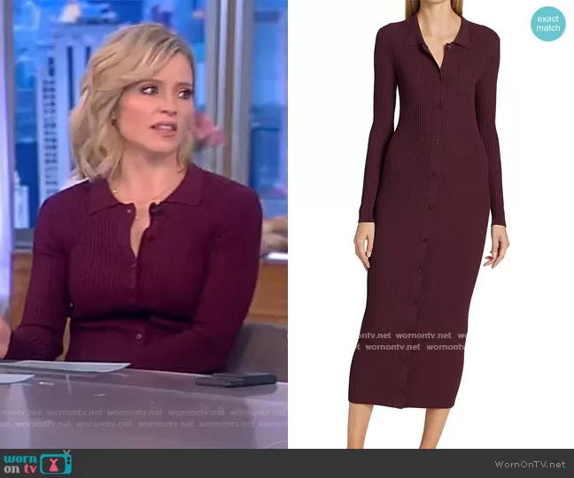 Sara Haines on The View on ABC was spotted wearing this burgundy ribbed dress on The View on Feb 02 2022's episode. Sara's Dress is the Napa polo dress by Staud.