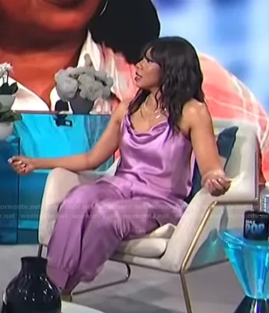 on E! News on E! was spotted wearing this lilac cowl neck cami and pants on E! News Daily Pop on Feb 02 2022's episode. 's Camisole is the Marta Silk Satin Camisole by Cinq a Sept . 's Pants is the Tous Les Jours Giles Satin Jogger Pants by Cinq a Sept.