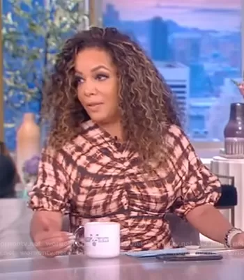 Sunny Hostin on The View on ABC was spotted wearing this beige tie dye check dress on The View on Feb 03 2022's episode. Sunny's Dress is the Tie-Dye Cinched Dress by Proenza Schouler.