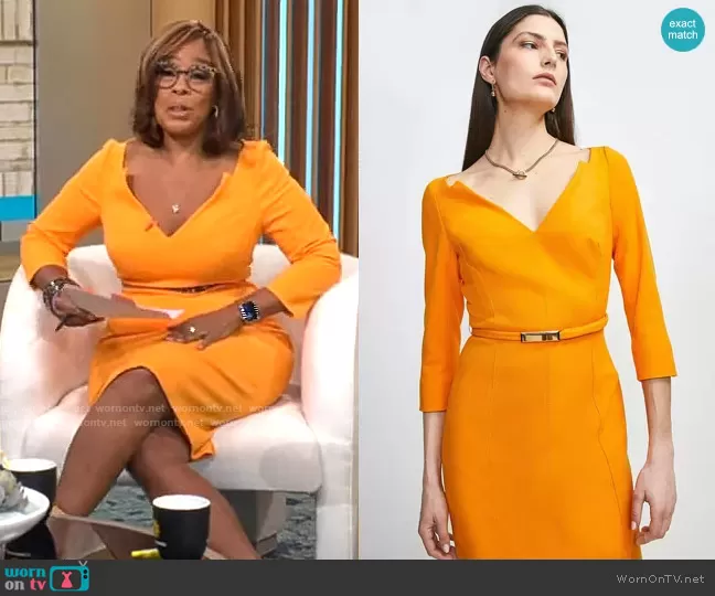 Gayle King on CBS Mornings on CBS was spotted wearing this orange v-neck dress on CBS Mornings on Sep 12 2024's episode. Gayle's Dress is the Forever Bar Belt Dress in Orange by Karen Millen .