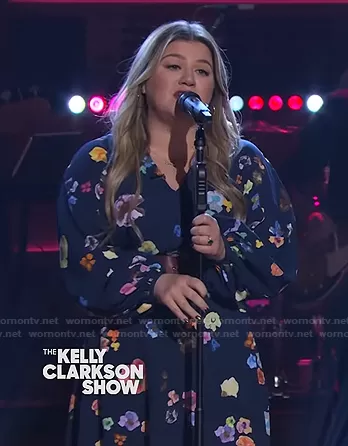 Kelly Clarkson on The Kelly Clarkson Show on NBC was spotted wearing this navy floral v-neck dress on The Kelly Clarkson Show on Feb 03 2022's episode. Kelly's Dress is the Rosen Dress by Stine Goya.