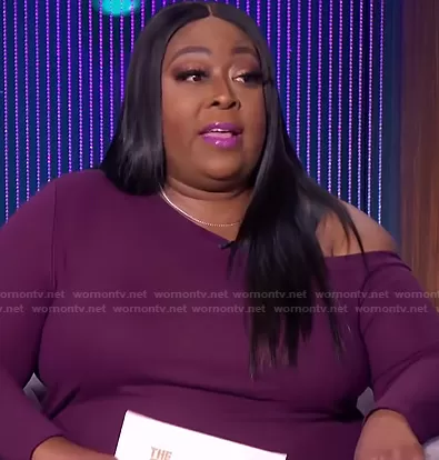 Loni Love on The Real on BETher was spotted wearing this purple one off-shoulder dress on The Real on Feb 03 2022's episode. Loni's Dress is the One Shoulder Fitted Dress by Eloquii.
