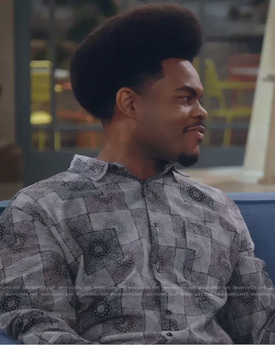Carter (played by Julian Gant) on Call Me Kat on Fox was spotted wearing this grey printed button down shirt on Call Me Kat on episode 'Call Me Your Biggest Fan' (2x05) in Feb 2022. Carter's Shirt is the Oversized Bandana Cotton Button-Up Shirt by BP.
