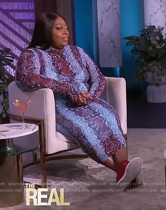 Loni Love on The Real on BETher was spotted wearing this blue snakeskin print mesh dress on The Real on Feb 07 2022's episode. Loni's Dress is the Shailene Long Sleeve Mesh Midi Dress by AFRM.