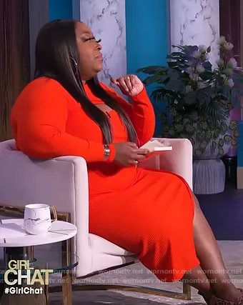 Loni Love on The Real on BETher was spotted wearing this red cutout dress on The Real on Feb 07 2022's episode. Loni's Dress is the Cutout Detail Turtleneck Sweater Dress by Eloquii.