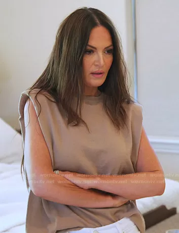 Lisa Barlow on The Real Housewives of Salt Lake City on Bravo was spotted wearing this beige padded shoulder top on The Real Housewives of Salt Lake City on episode 'Memorial Meltdown' (2x20) in Feb 2022. Lisa's Top is the Prince Top by LouLou Studio.