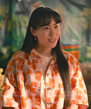 (played by ) on Sweet Magnolias on Netflix was spotted wearing this orange floral short sleeve shirt on Sweet Magnolias on episode 'Great Expectations' (2x05) in Feb 2022. 's Top is the Floral Print Shirt by Zara.