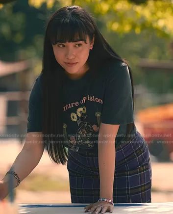 (played by ) on Sweet Magnolias on Netflix was spotted wearing this black floral tee and purple check mini skirt on Sweet Magnolias on episode 'Great Expectations' (2x05) in Feb 2022. 's Top is the Printed T-shirt By H&M . 's Skirt is the Daisy Street Coordinating Mini Skirt by Asos.