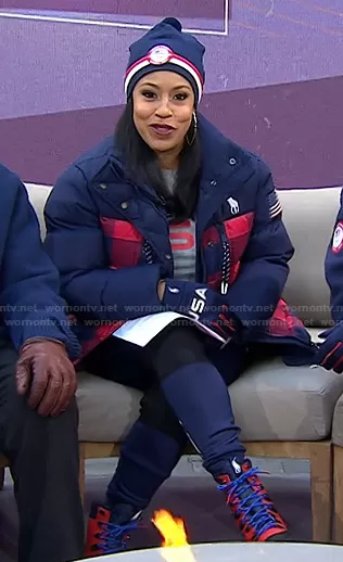 Sheinelle Jones on Today on NBC was spotted wearing this navy and red check puffer jacket on Today on Feb 08 2022's episode. Sheinelle's Top is the Team USA Jersey Graphic Tee by Ralph Lauren . Sheinelle's Jacket is the Team USA Closing Ceremony Down Jacket by Ralph Lauren . Sheinelle's Leggings is the Team USA Closing Ceremony Legging by Ralph Lauren . Sheinelle's Hat is the Team USA Closing Ceremony Beanie by Ralph Lauren . Sheinelle's Gloves is the Team USA Closing Ceremony Gloves by Ralph Lauren . Sheinelle's Shoes is the Team USA Opening Ceremony Boots by Ralph Lauren.