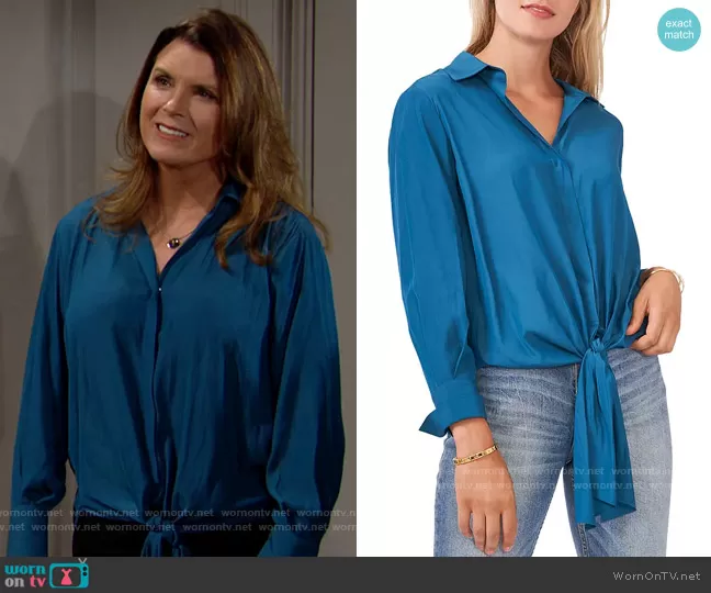 Sheila Carter (played by Kimberlin Brown) on The Bold and the Beautiful on CBS was spotted wearing this blue tie front button down blouse on The Bold and the Beautiful on Feb 08 2022's episode. Sheila's Top is the Tie Front Blouse in Blueberry by Vince Camuto.