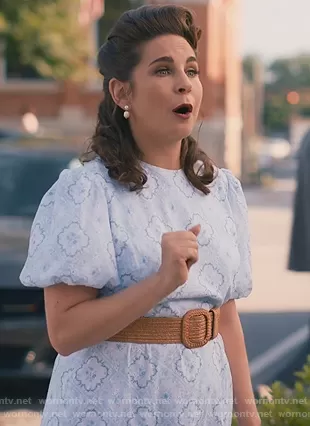 (played by ) on Sweet Magnolias on Netflix was spotted wearing this blue floral print maxi dress on Sweet Magnolias on episode 'Dear Heart' (2x09) in Feb 2022. 's Dress is the x Born on Fifth Belmondo Puff Sleeve Tile Print Ankle Length Dress by Antonio Melani.