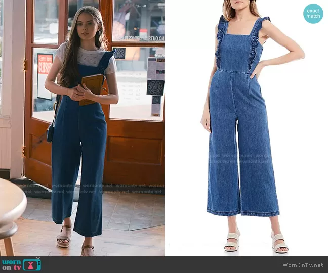 (played by ) on Sweet Magnolias on Netflix was spotted wearing this ruffled denim jumpsuit on Sweet Magnolias on episode 'If Thou Wilt, Remember' (2x10) in Feb 2022. 's Jumpsuit is the Ruffle Denim Jumpsuit by GB.
