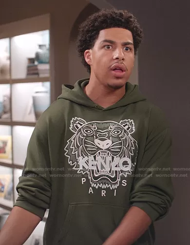 Andre Johnson Jr (played by Marcus Scribner) on Black-ish on ABC was spotted wearing this green tiger hoodie on Black-ish on episode 'Mom Mentor' (8x06) in Feb 2022. Junior's Sweater is the Tiger Motif Embroidered Hoodie by Kenzo.