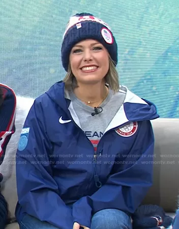 Dylan Dreyer on Today on NBC was spotted wearing this grey print top and beanie on Today on Feb 10 2022's episode. Dylan's Top is the Team USA Jersey Graphic Tee by Ralph Lauren . Dylan's Hat is the The Team USA Beanie with Yarn Pom by Sh*t That I Knit.