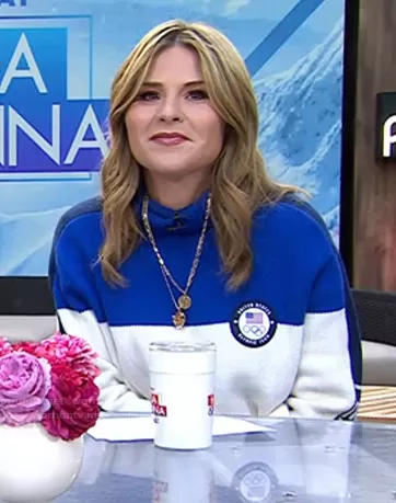 on Today on NBC was spotted wearing this blue and white colorblock sweater on Today on Feb 10 2022's episode. 's Sweater is the Team USA Wool Sweater by Ralph Lauren . 's Gloves is the Team USA Closing Ceremony Gloves by Ralph Lauren.