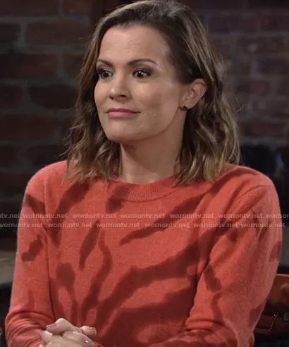 Chelsea Lawson (played by Melissa Claire Egan) on The Young and the Restless on CBS was spotted wearing this orange tie dye sweater on The Young and the Restless on Feb 10 2022's episode. Chelsea's Sweater is the Betty Tie Dye Sweater by 27 Miles Malibu.