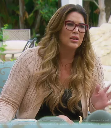 Emily Simpson on The Real Housewives of Orange County on Bravo was spotted wearing this beige cable knit cardigan on The Real Housewives of Orange County on episode 'Runaway Husband' (16x09) in Feb 2022. Emily's Sweater is the Cropped Cable Cardigan by 525 . Emily's Sunglasses is the Joyann Burgundy Sunglasses by Kate Spade.