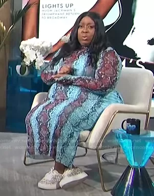 Loni Love on E! News on E! was spotted wearing this blue snake print mock neck dress on E! News Daily Pop on Feb 10 2022's episode. Loni's Dress is the Shailene Long Sleeve Mesh Midi Dress by AFRM.