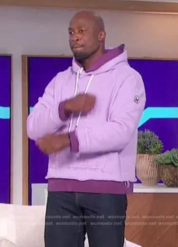 Akbar Gbajabiamila on The Talk on CBS was spotted wearing this lavender layered hoodie on The Talk on Feb 10 2022's episode. Akbar's Sweater is the Double Layer Hoodie by Palm Angels.
