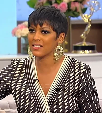 Tamron Hall on Tamron Hall Show on ABC was spotted wearing this black teardrop print wrap dress on Tamron Hall Show on Feb 10 2022's episode. Tamron's Dress is the Print Silk Dress with Scarf by Gucci.
