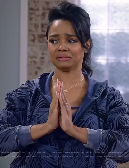 Randi (played by Kyla Pratt) on Call Me Kat on Fox was spotted wearing this blue palm leaf print hoodie on Call Me Kat on episode 'Call Me Unfaithful' (2x06) in Feb 2022. Randi's Sweatshirt is the Full Zip French Terry Acid Wash Hoodie in Blue/Leaf by Joylab at Target . Randi's Bra is the Printed Racerback Bra in Antique Blue by Joylab at Target.
