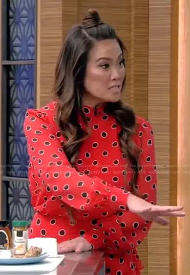 on Live with Kelly and Mark on Disney ABC Home Entertainment was spotted wearing this red polka dot dress on Live with Kelly and Ryan on Feb 11 2022's episode. 's Dress is the Isa Dress by Saloni.