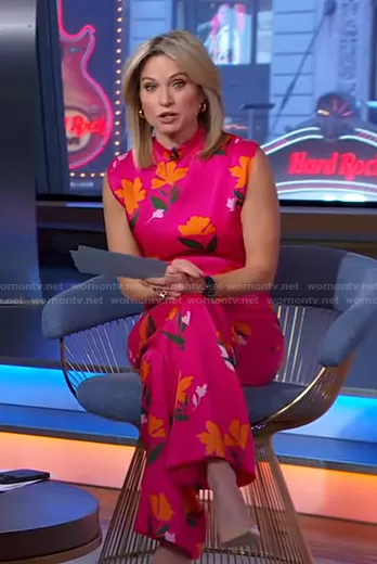 Amy Robach on Good Morning America on ABC was spotted wearing this pink floral jumpsuit on Good Morning America on Feb 11 2022's episode. Amy's Jumpsuit is the Long Print Jumpsuit by Zara.